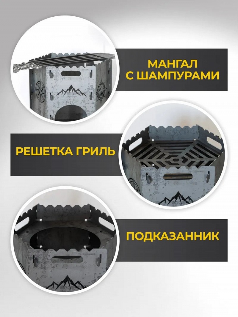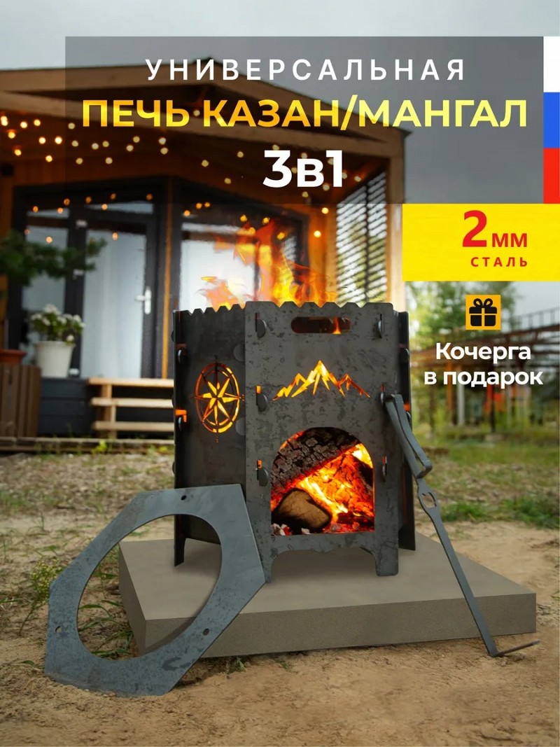 Компактный и вместительный очаг изготовлен из прочной стали с эксклюзивным декором в духе экспедиций и приключений. Печка для казана - это прекрасный подарок с душой и заботой на день рождения, новоселье, новый год, для тех, кто вам дорог.