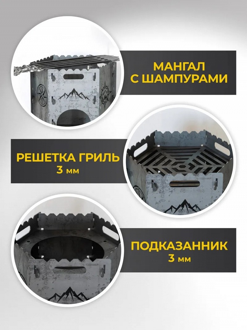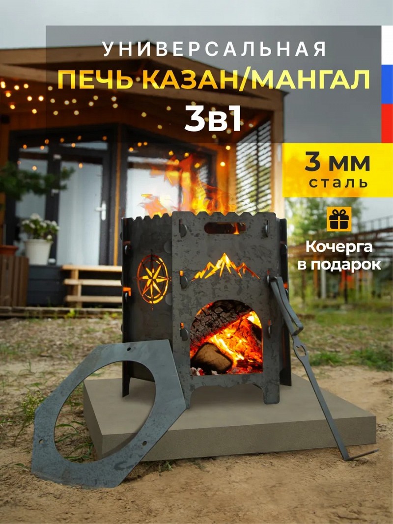 Компактный и вместительный очаг изготовлен из прочной стали с эксклюзивным декором в духе экспедиций и приключений. Печка для казана - это прекрасный подарок с душой и заботой на день рождения, новоселье, новый год, для тех, кто вам дорог.