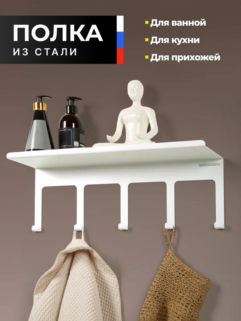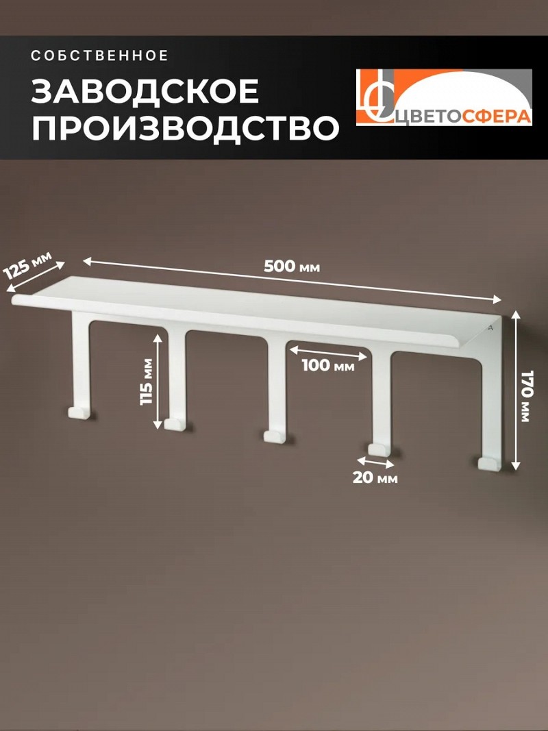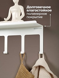 Полка металлическая настенная с крючками. Универсальная навесная полочка из коллекции "Минимализм" спроектирована для современных интерьеров кухни, прихожей, спальни, ванной и туалета.