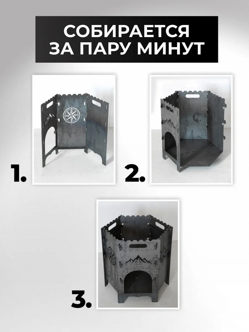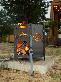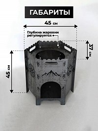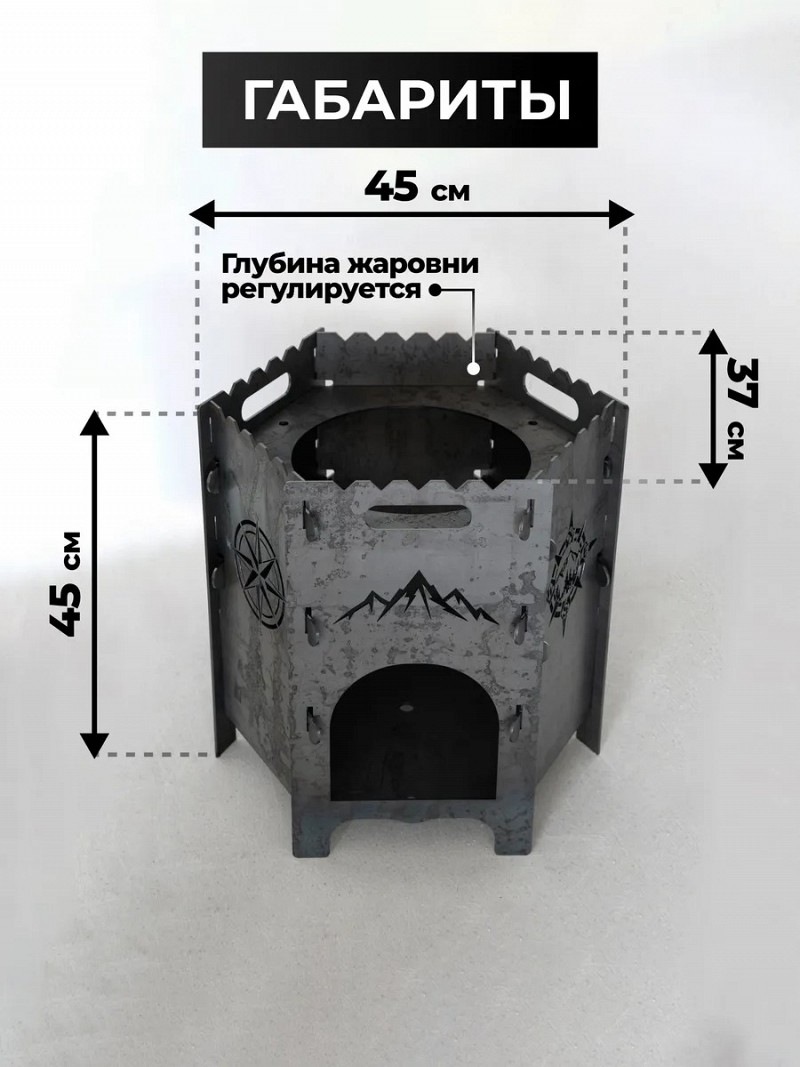 Компактный и вместительный очаг изготовлен из прочной стали с эксклюзивным декором в духе экспедиций и приключений. Печка для казана - это прекрасный подарок с душой и заботой на день рождения, новоселье, новый год, для тех, кто вам дорог.