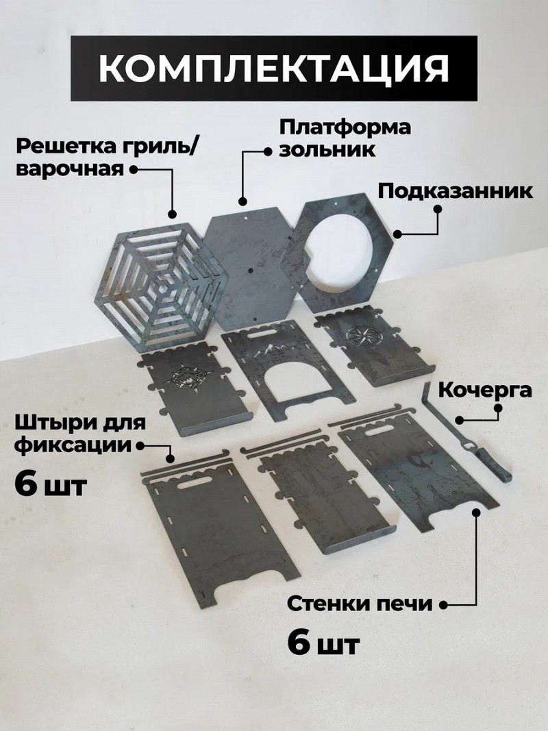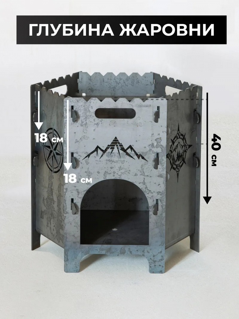 Компактный и вместительный очаг изготовлен из прочной стали с эксклюзивным декором в духе экспедиций и приключений. Печка для казана - это прекрасный подарок с душой и заботой на день рождения, новоселье, новый год, для тех, кто вам дорог.