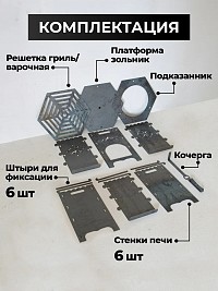 Многофункциональная универсальная печь под казан из стали оснащена мангалом для шампуров, плиткой для гриля, кастрюль чайников, подказанником.