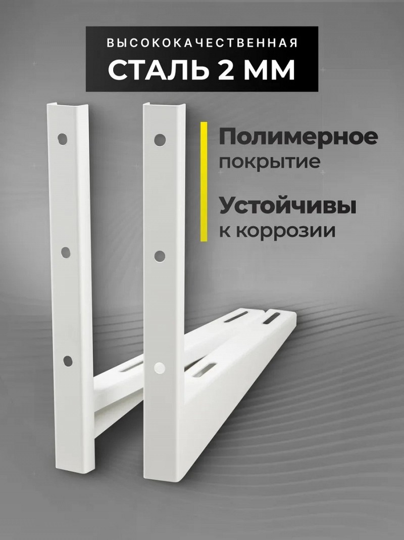 Рекомендованная нагрузка на настенный кронштейн 120 кг. Изготовленный из стали 2 мм кронштейн устойчив к внешним воздействиям. Для защиты кронштена от погодных условий используется стойкое полимерное покрытие. Простота в установке, универсальность конфигурации и размеров, подходит для большинства моделей кондиционеров.