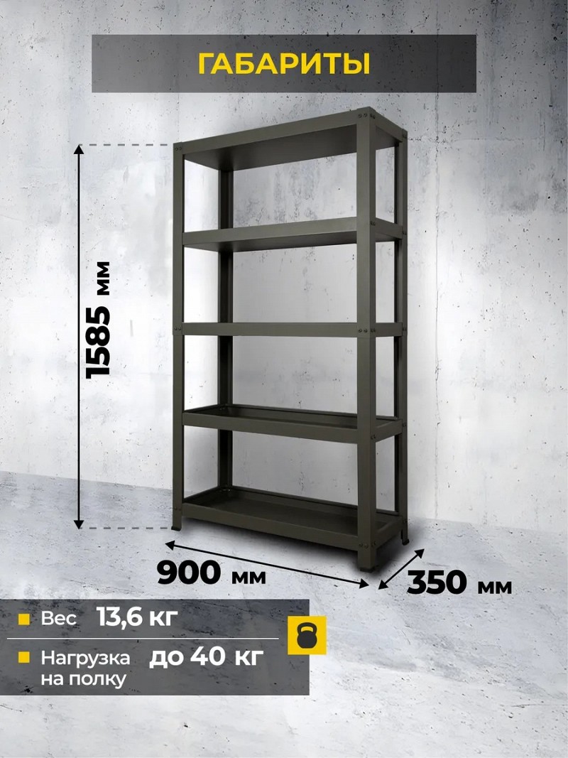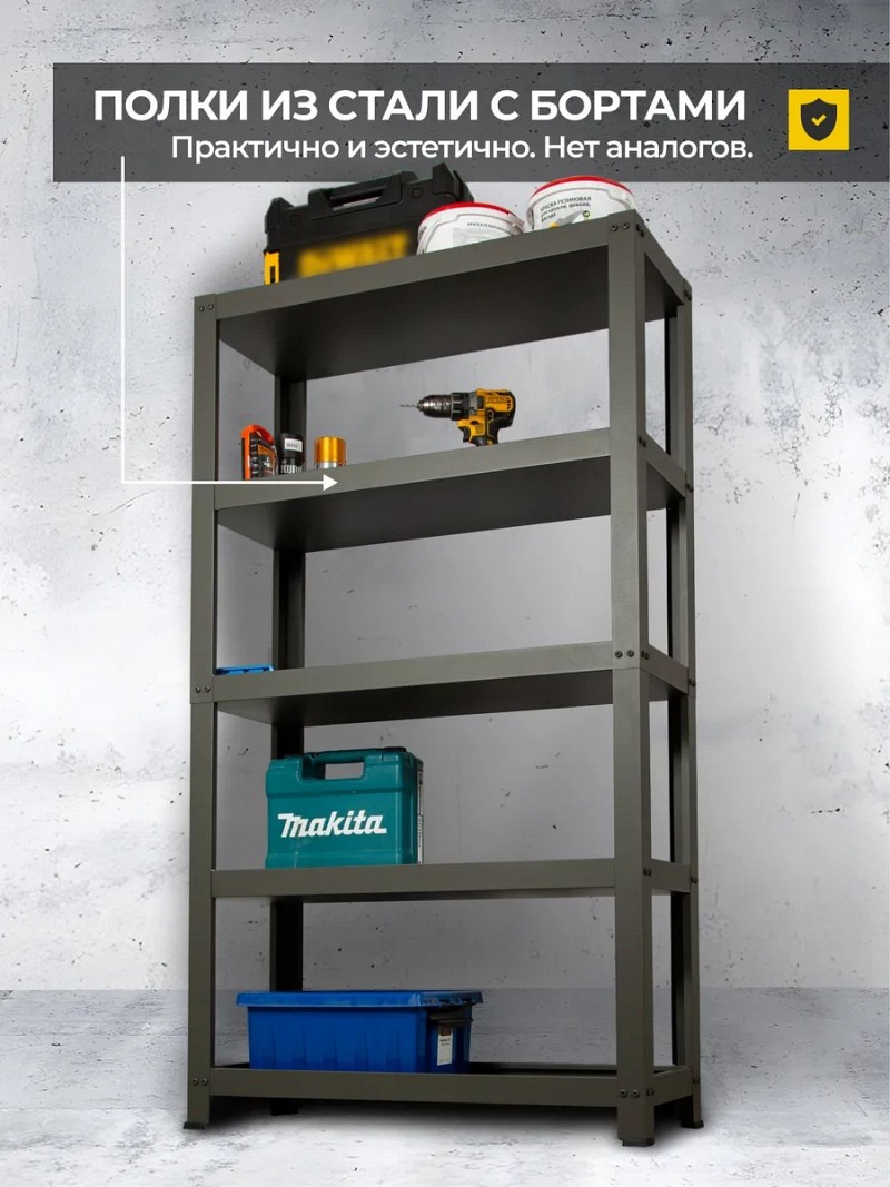 Стеллаж металлический для гаража, балкона, кладовой или мастерской выполнен полностью из стали 0,5 мм с полимерным покрытием.